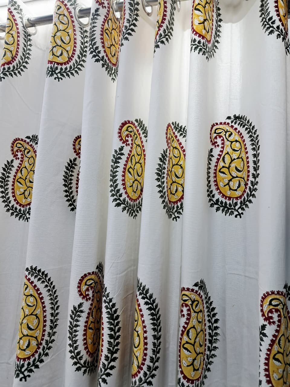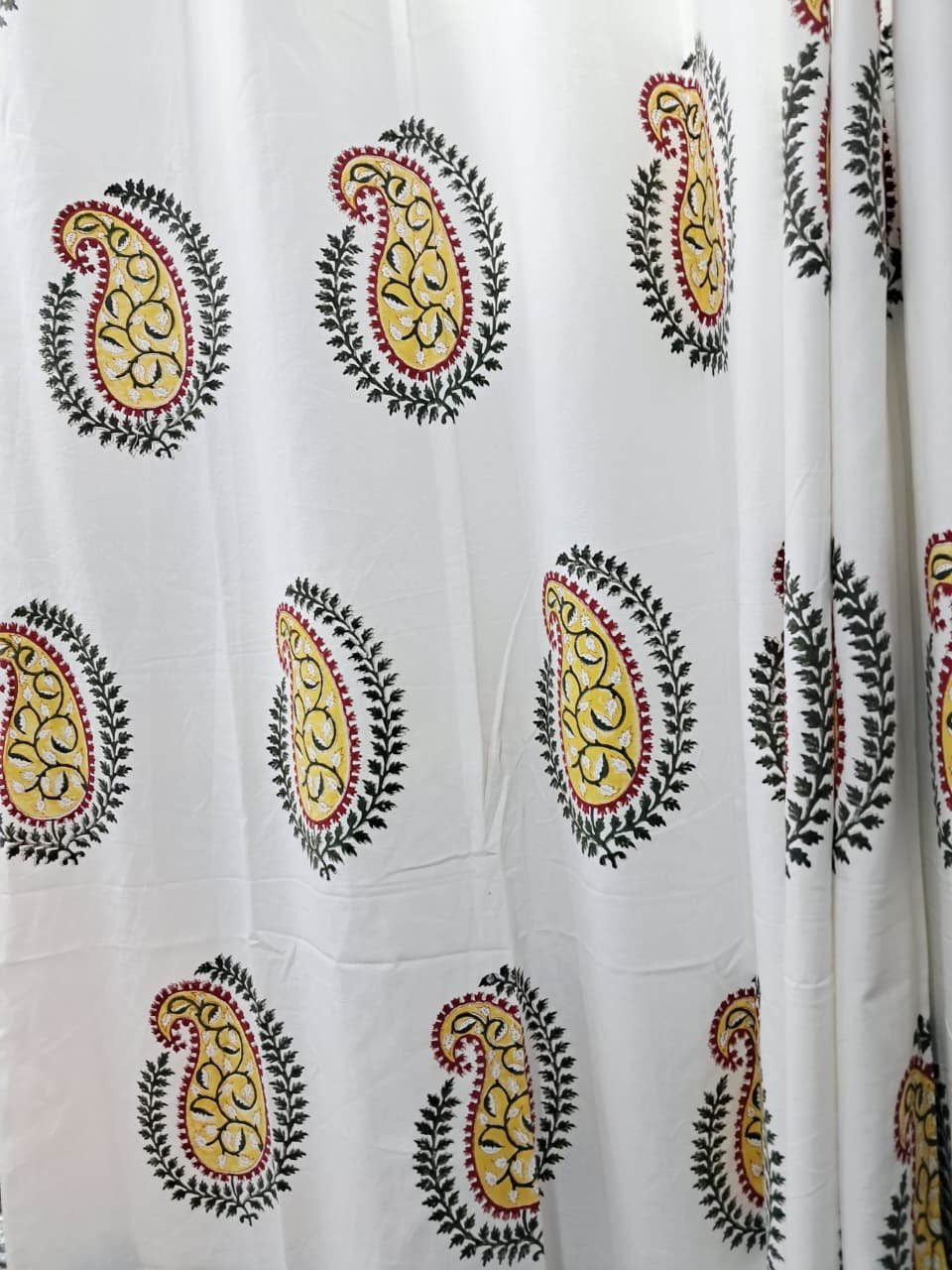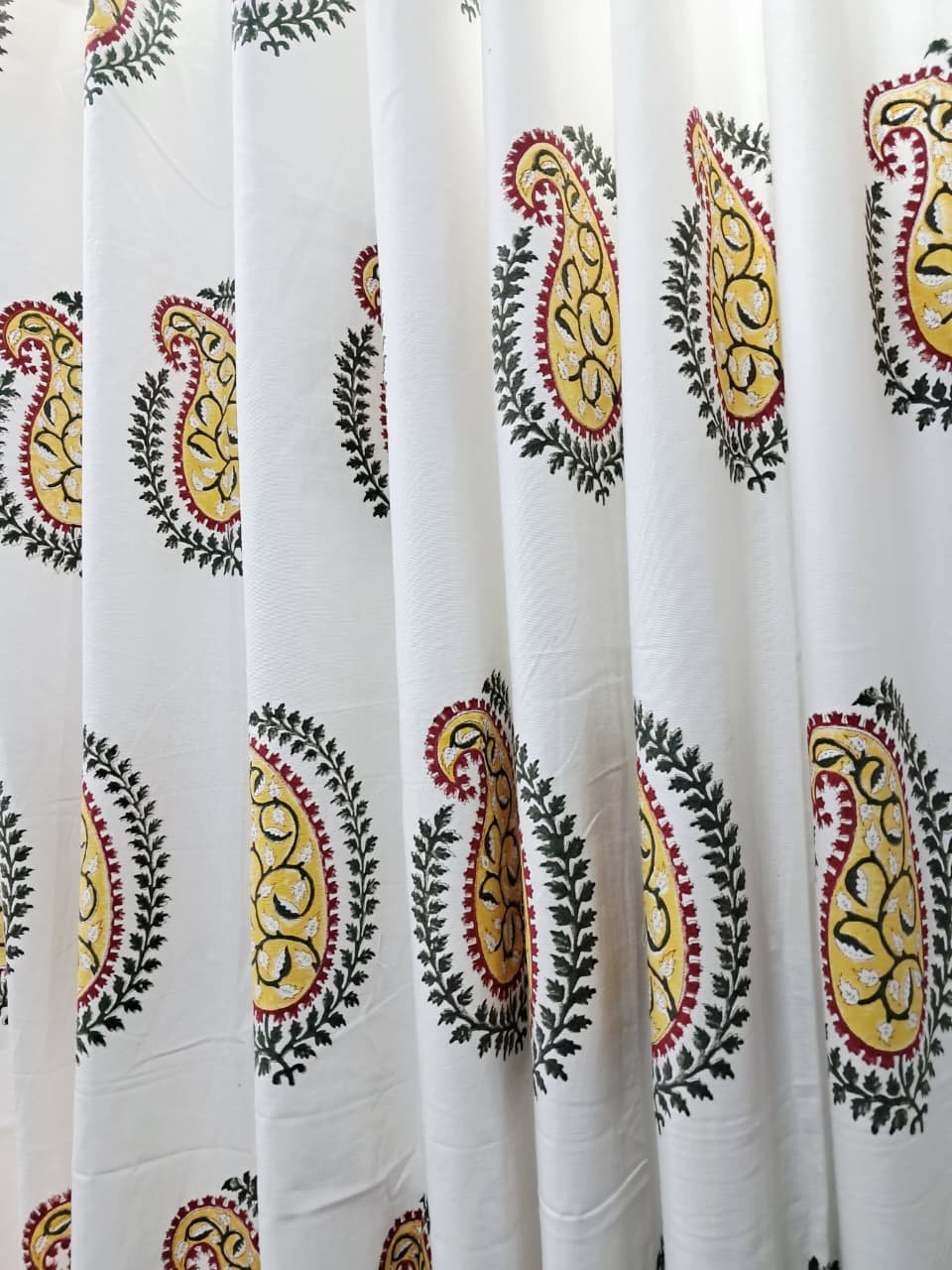 Bring a touch of regal artistry into your home with this beautifully handcrafted Jaipuri hand-block printed curtain. The design highlights large traditional paisley motifs filled with intricate vine detailing, stamped in warm yellow, deep green, and rich maroon tones. Each paisley is framed with an exquisite leaf border, celebrating the heritage aesthetics of Rajasthan.