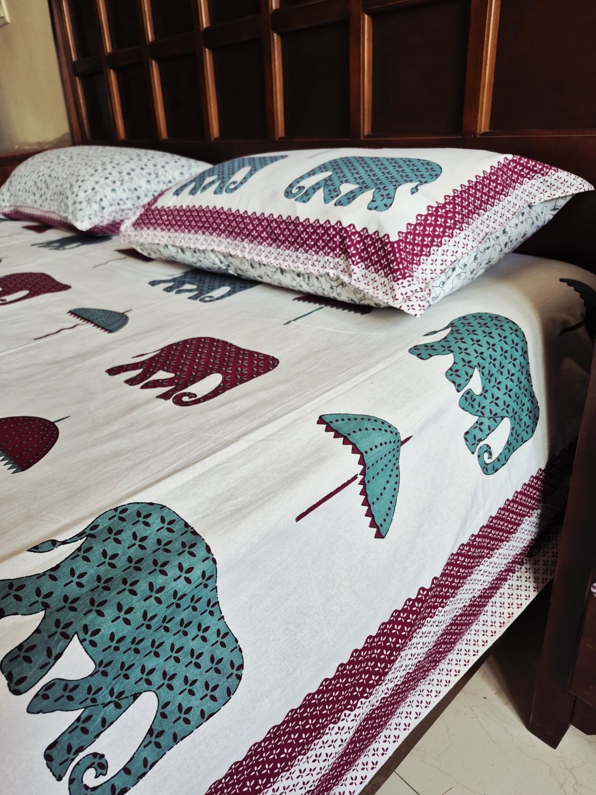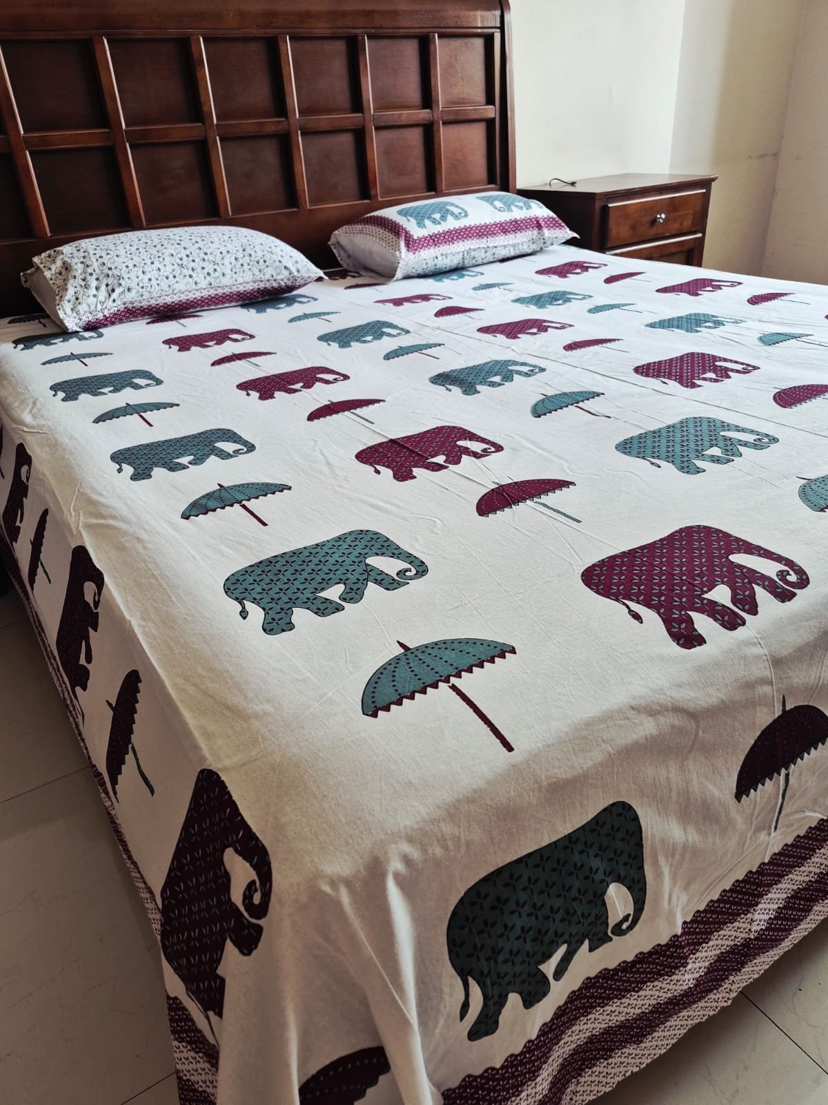 Generously sized in a Super King dimension (108×108 inches), the bedsheet drapes beautifully over the bed, offering ample coverage and a relaxed, elegant fall. Paired with matching pillow covers, it completes the setting with understated sophistication—perfect for homes that appreciate beauty in simplicity and comfort in everyday living.