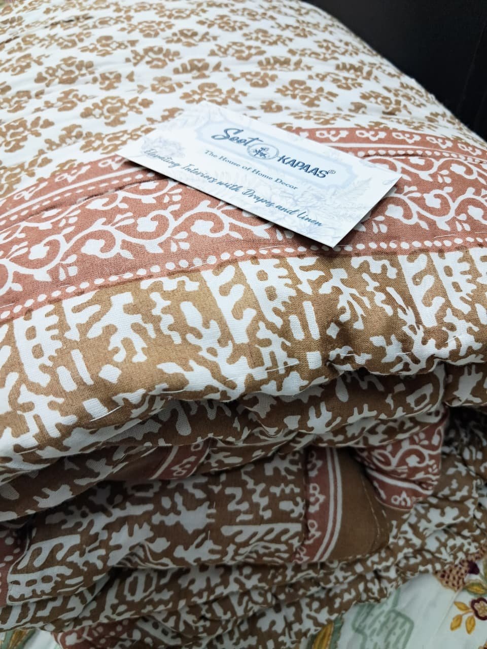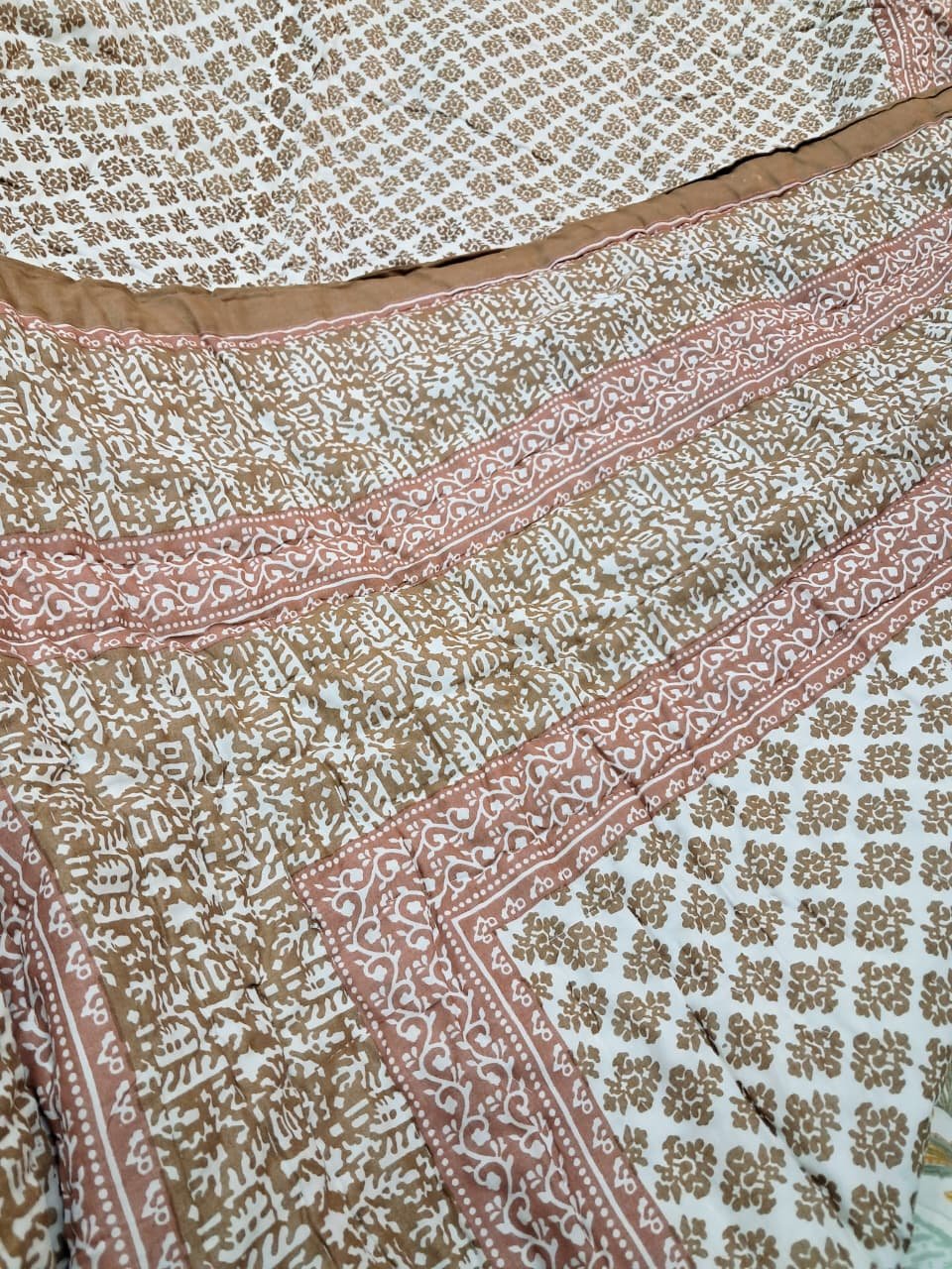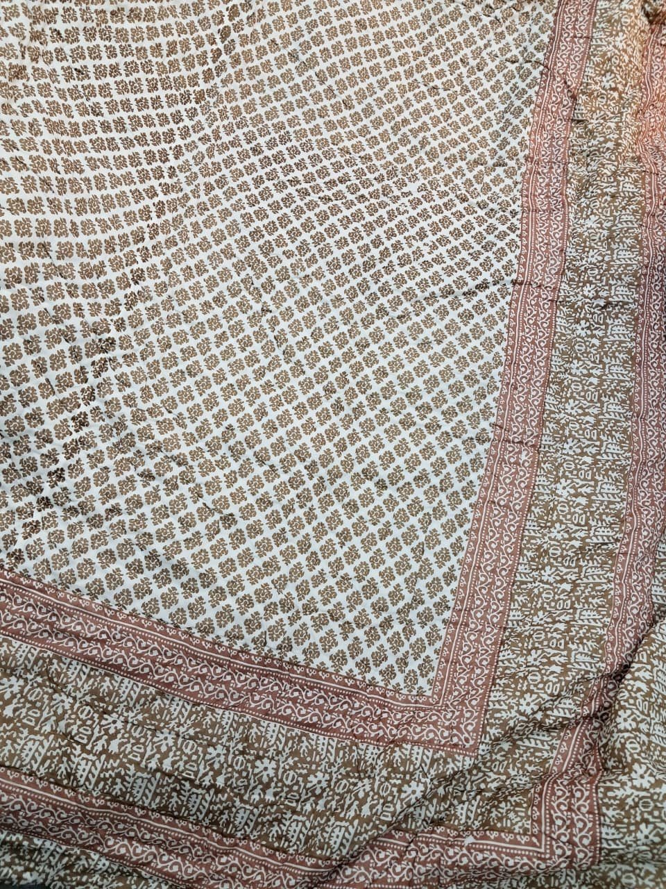 This Jaipuri Double Bed Razai showcases a serene blend of Screen Print and Block Style prints, inspired by traditional Rajasthani aesthetics. The design features delicate all-over floral butis arranged in a rhythmic layout, complemented by contrasting geometric and vine-inspired borders that frame the razai beautifully.