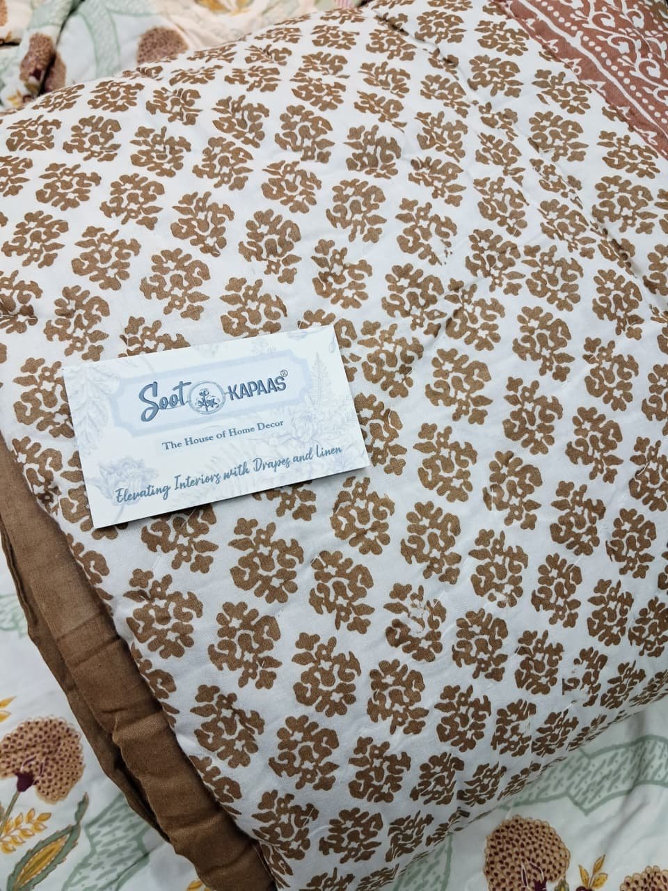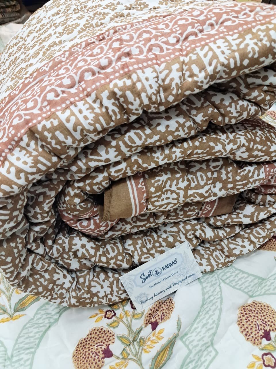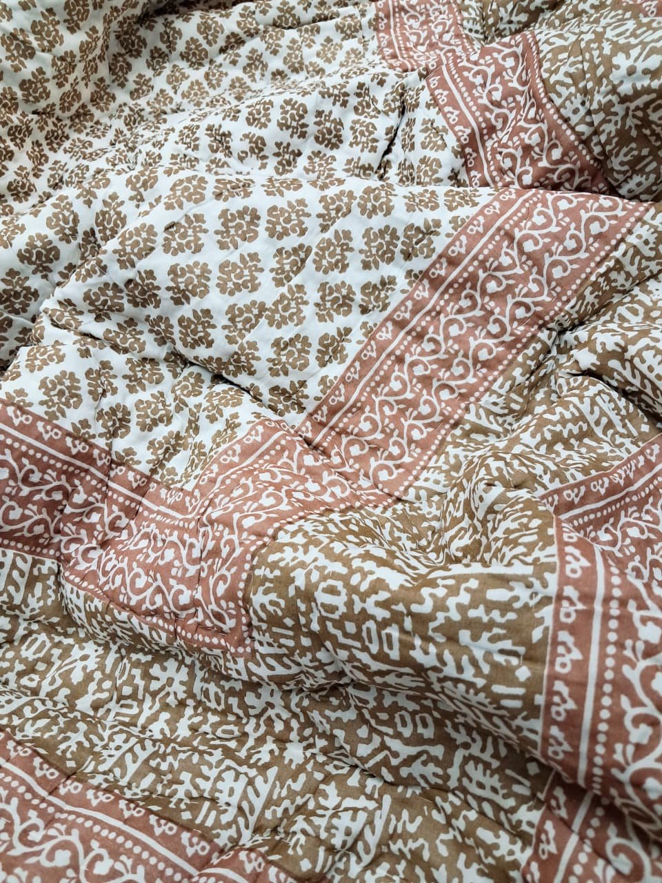 This Jaipuri Double Bed Razai showcases a serene blend of Screen Print and Block Style prints, inspired by traditional Rajasthani aesthetics. The design features delicate all-over floral butis arranged in a rhythmic layout, complemented by contrasting geometric and vine-inspired borders that frame the razai beautifully.