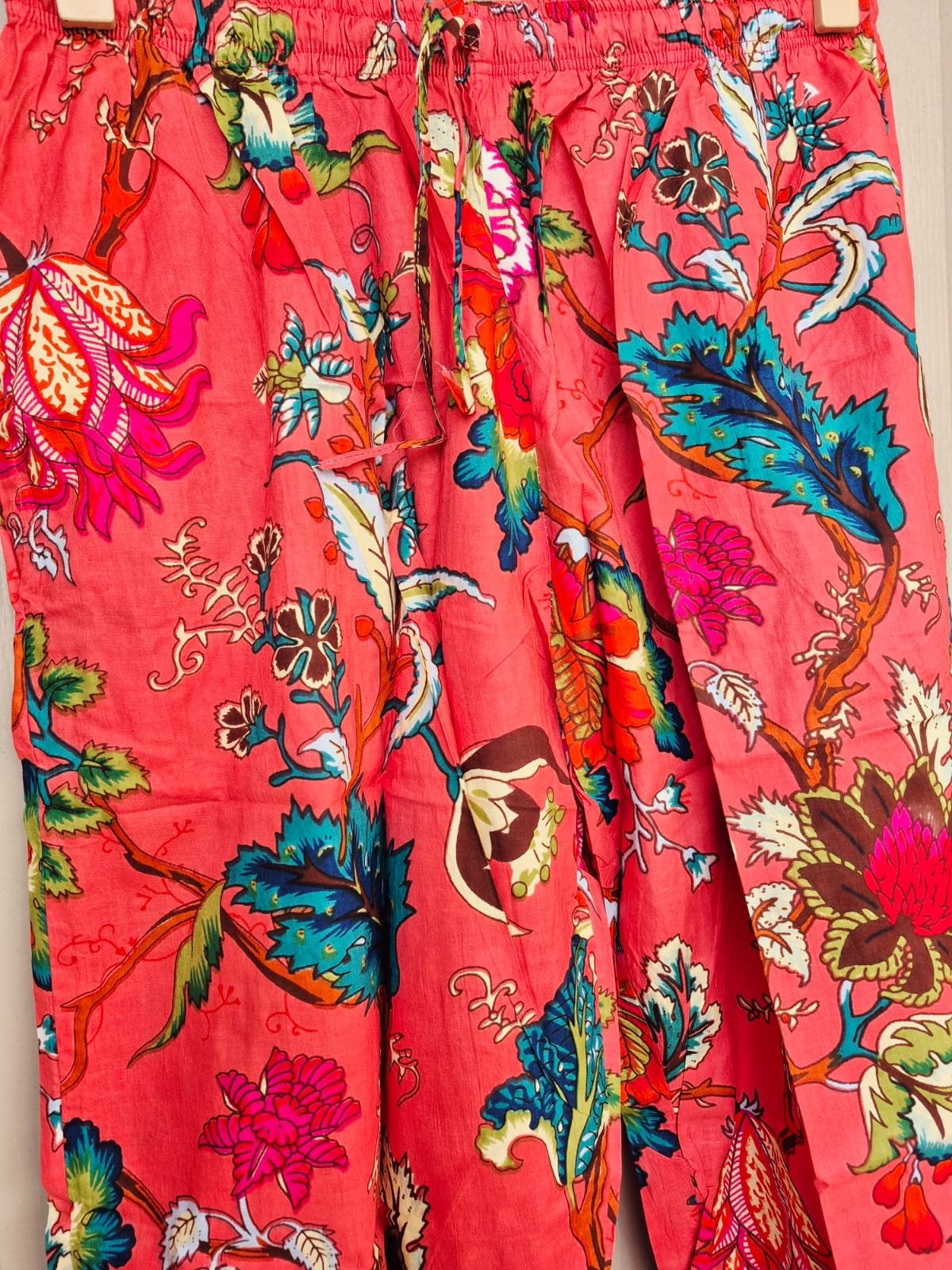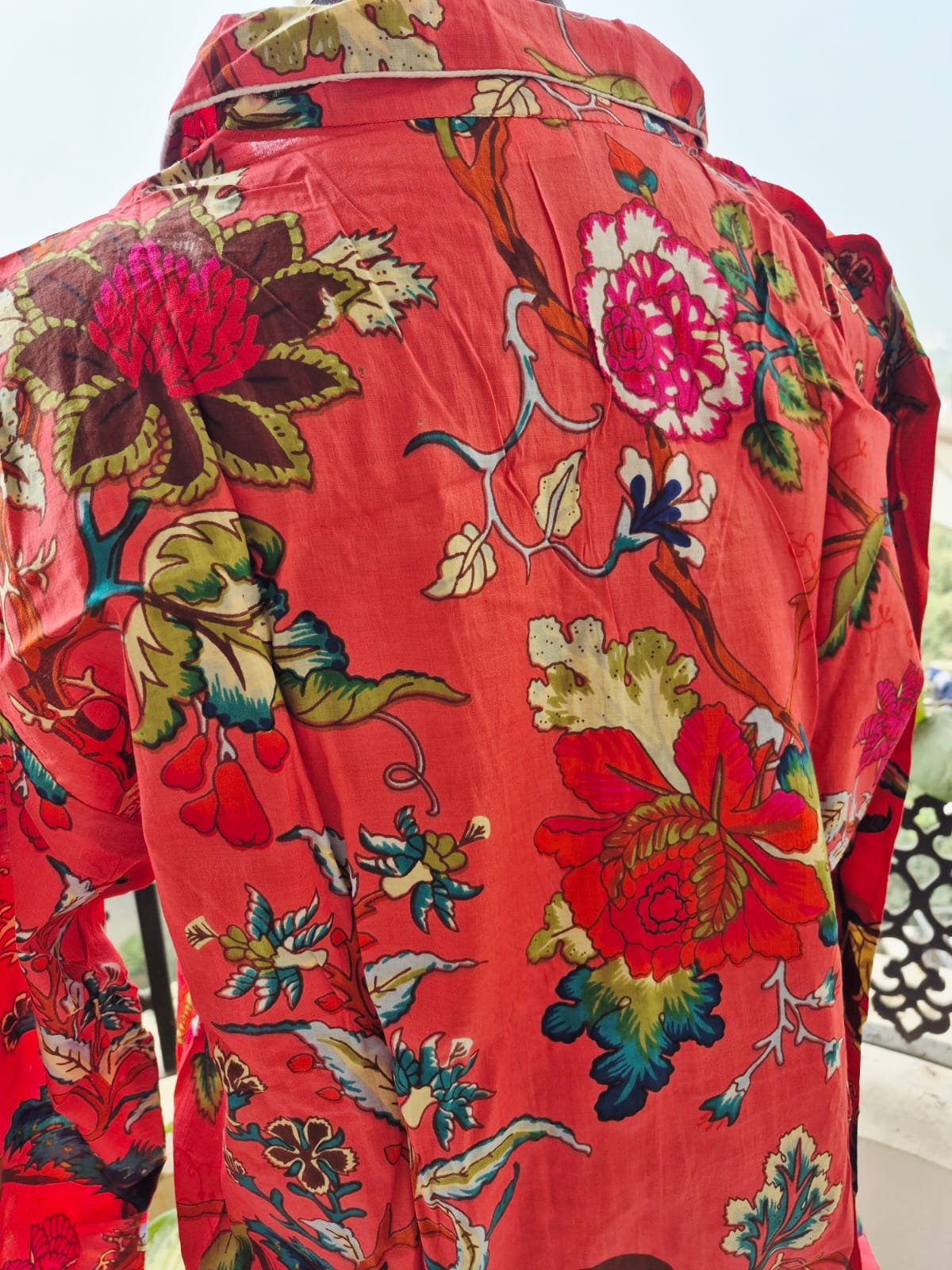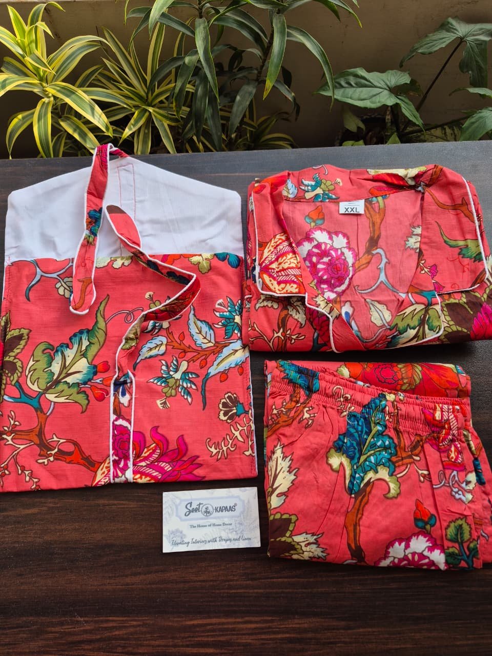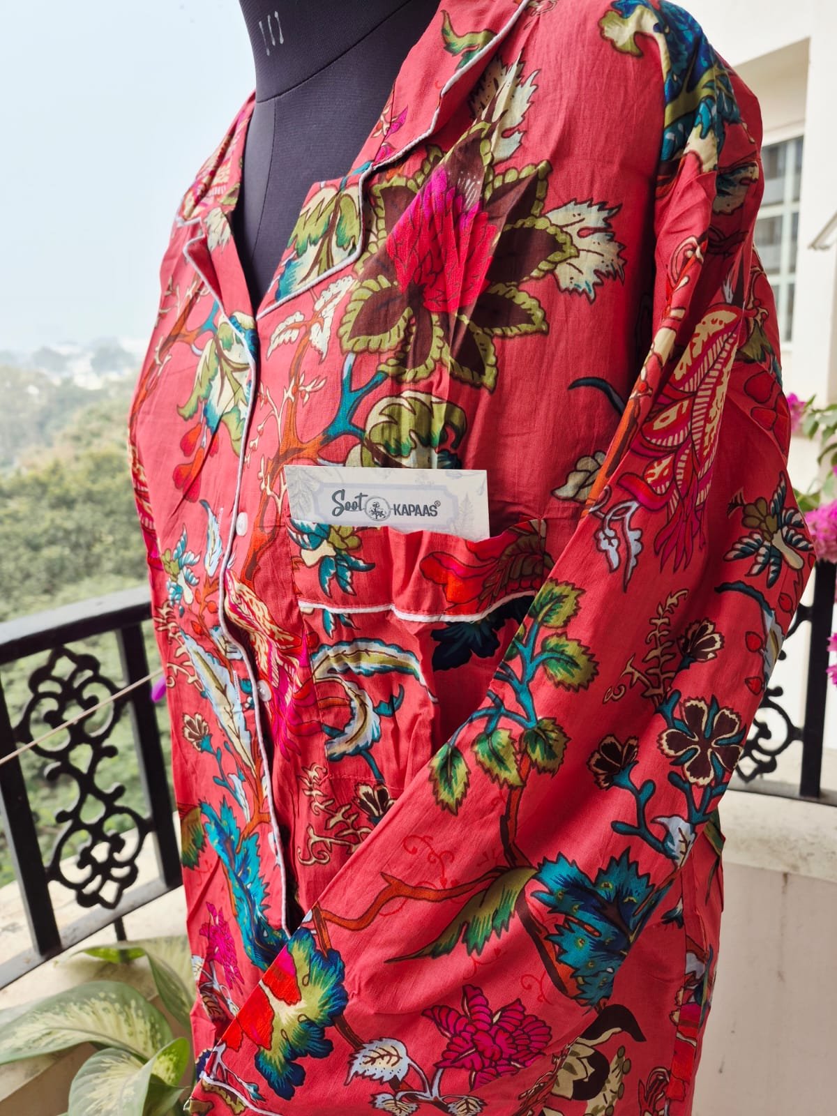 The set includes a full-sleeve button-down top with piping details and a relaxed-fit lower with an elasticated with adjustable draw-string waist, offering a comfortable yet flattering silhouette. The vibrant floral Jaipuri print adds a touch of timeless charm, making this nightwear as beautiful as it is functional.