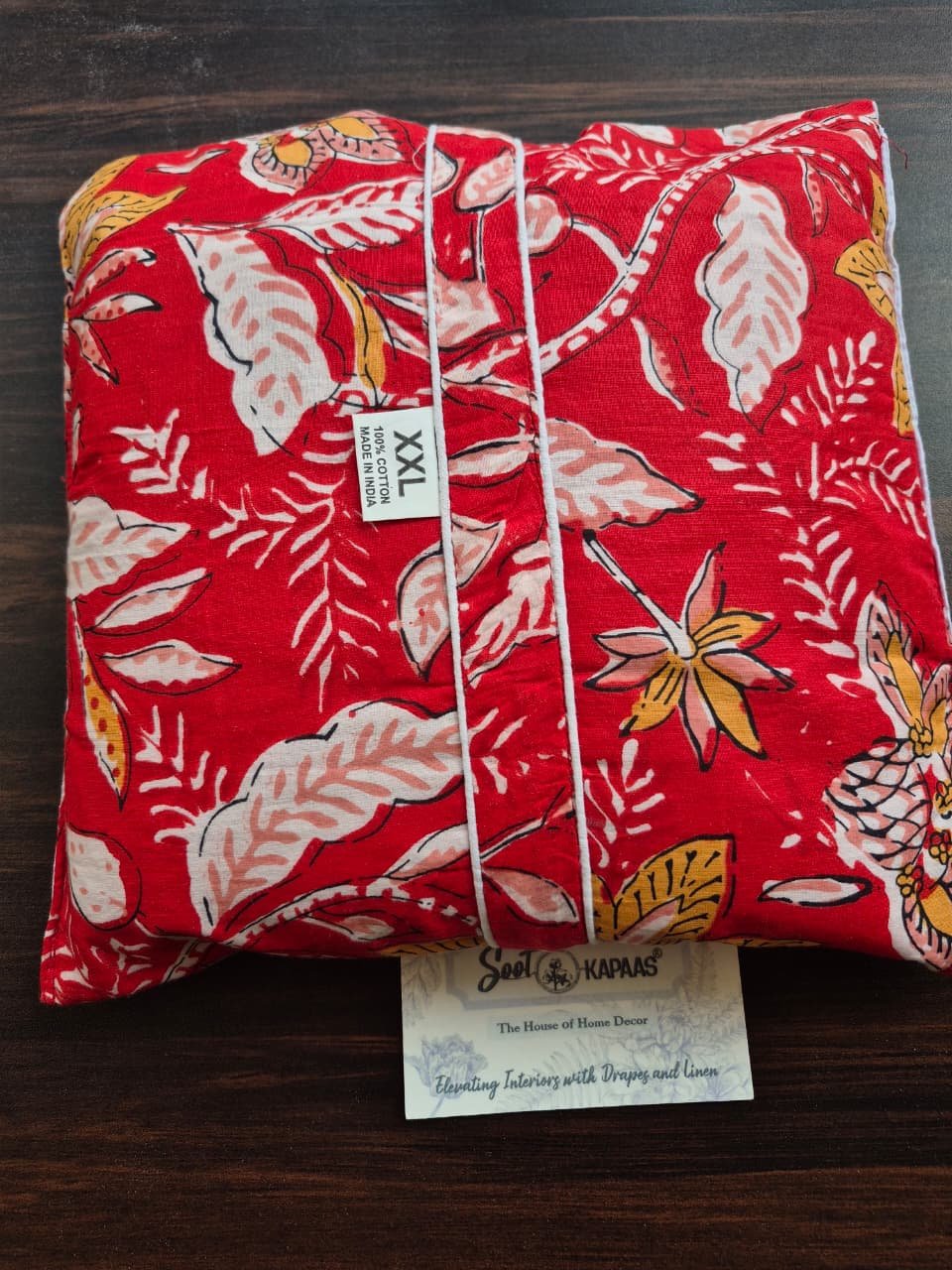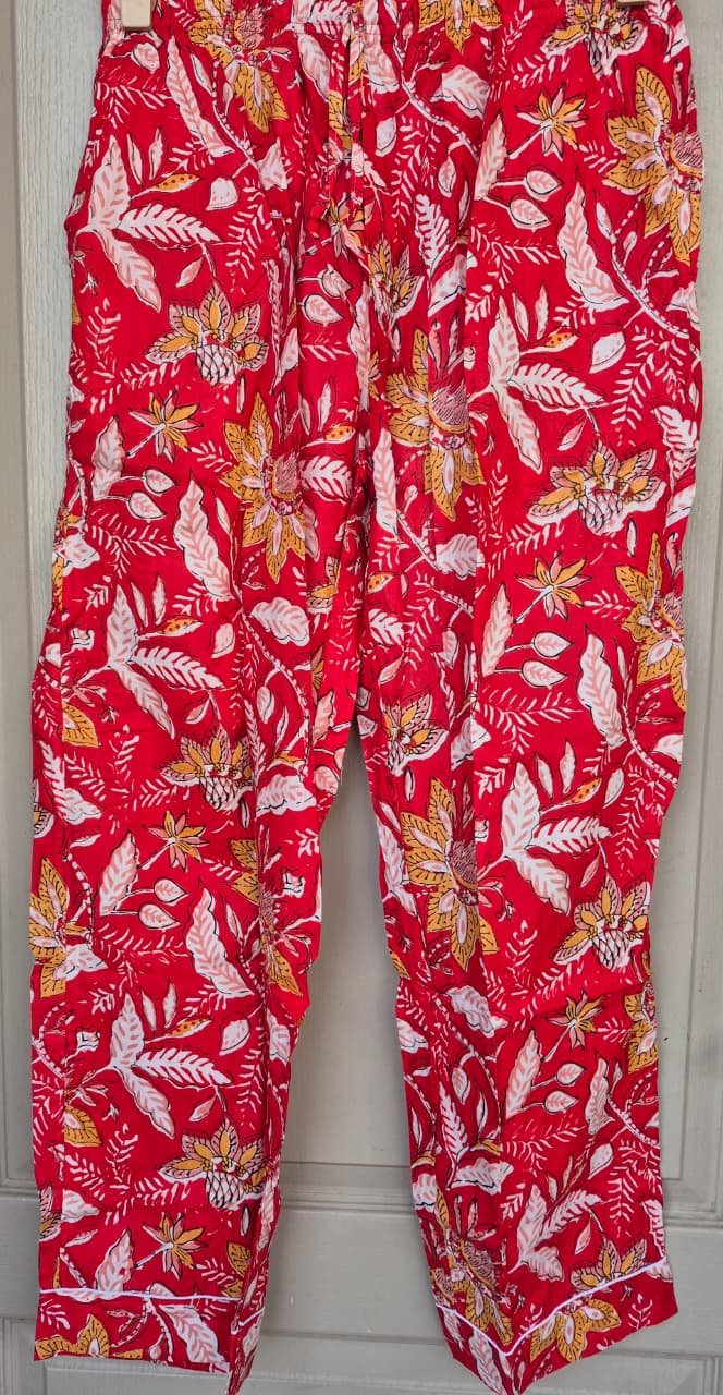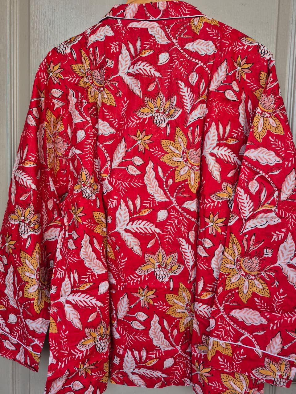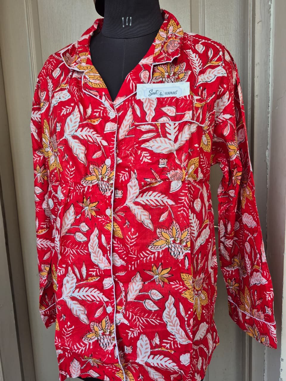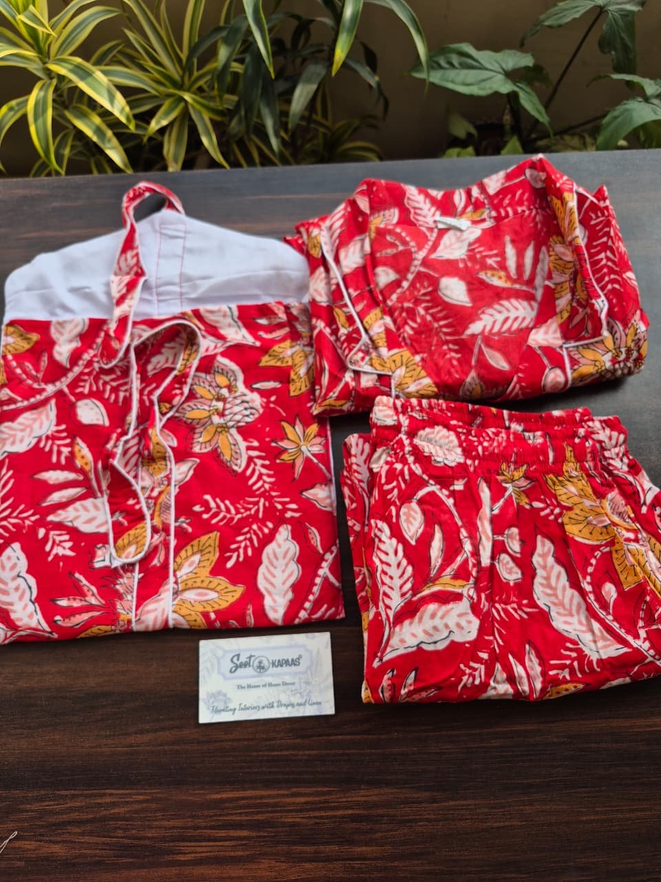 The set includes a full-sleeve button-down top with piping details and a relaxed-fit lower with an elasticated with adjustable draw-string waist, offering a comfortable yet flattering silhouette. The vibrant floral Jaipuri print adds a touch of timeless charm, making this nightwear as beautiful as it is functional.