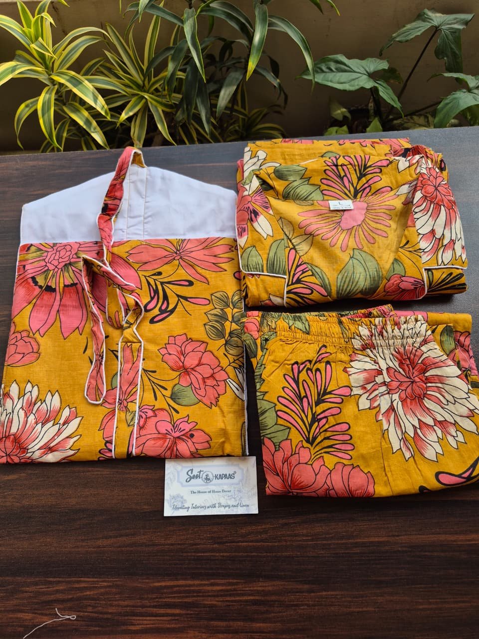 To complete the set, it comes with a coordinated carry-in pouch, ideal for storing your sleepwear neatly or carrying it while traveling. A perfect blend of comfort, craftsmanship, and thoughtful design, this sleeping suit is a must-have in your loungewear collection.