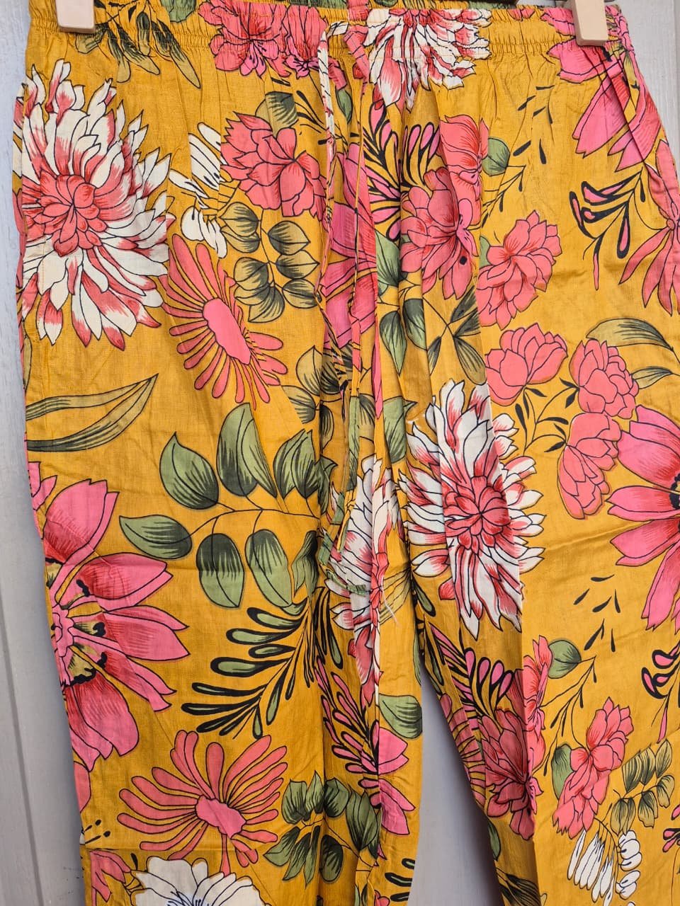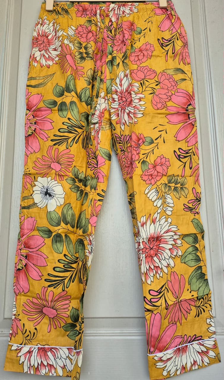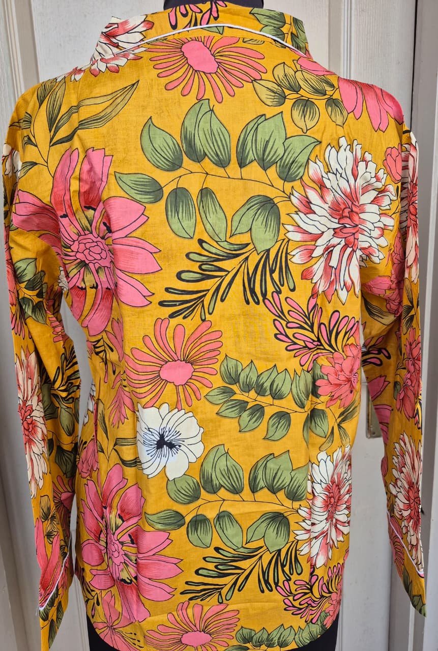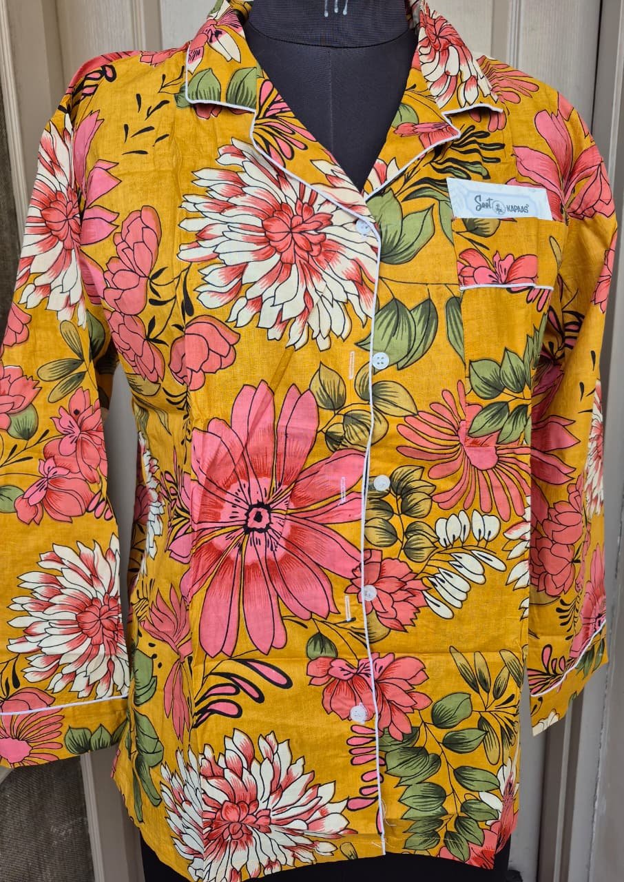 The set includes a full-sleeve button-down top with piping details and a relaxed-fit lower with an elasticated with adjustable draw-string waist, offering a comfortable yet flattering silhouette. The vibrant floral Jaipuri print adds a touch of timeless charm, making this nightwear as beautiful as it is functional.