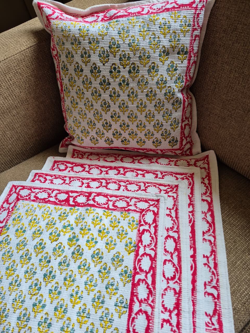 This thoughtfully designed set of 5 cushion covers is crafted from traditional Katha cotton fabric, celebrated for its distinctive woven texture and rich handcrafted appeal. The fabric’s subtle surface variation comes from the interplay of thick and fine cotton yarns during weaving, lending depth, character, and a pleasing tactile feel while remaining soft and breathable.