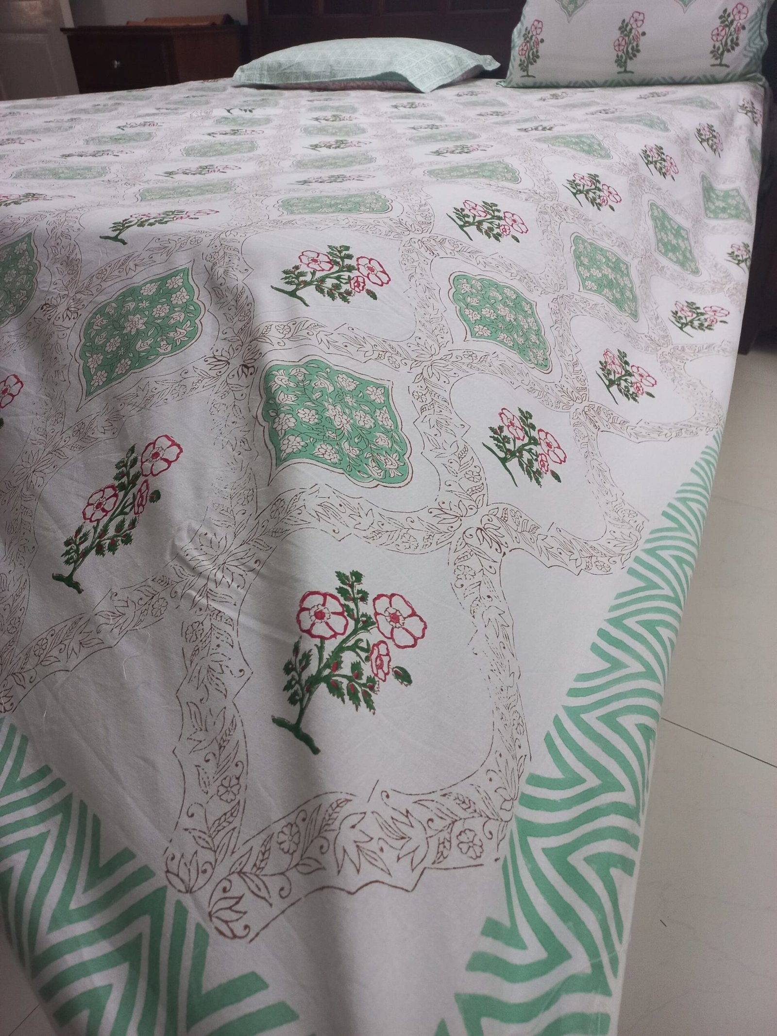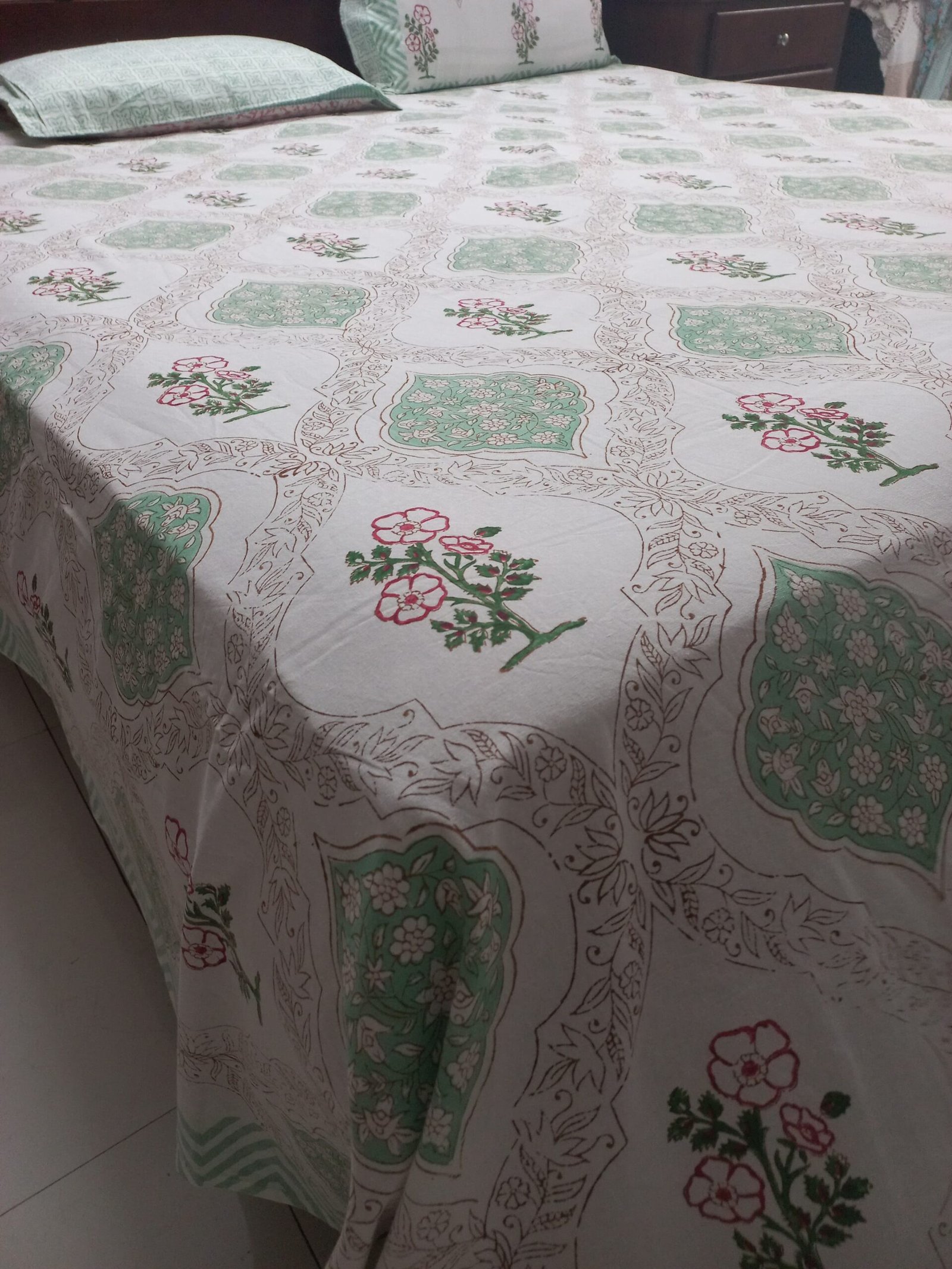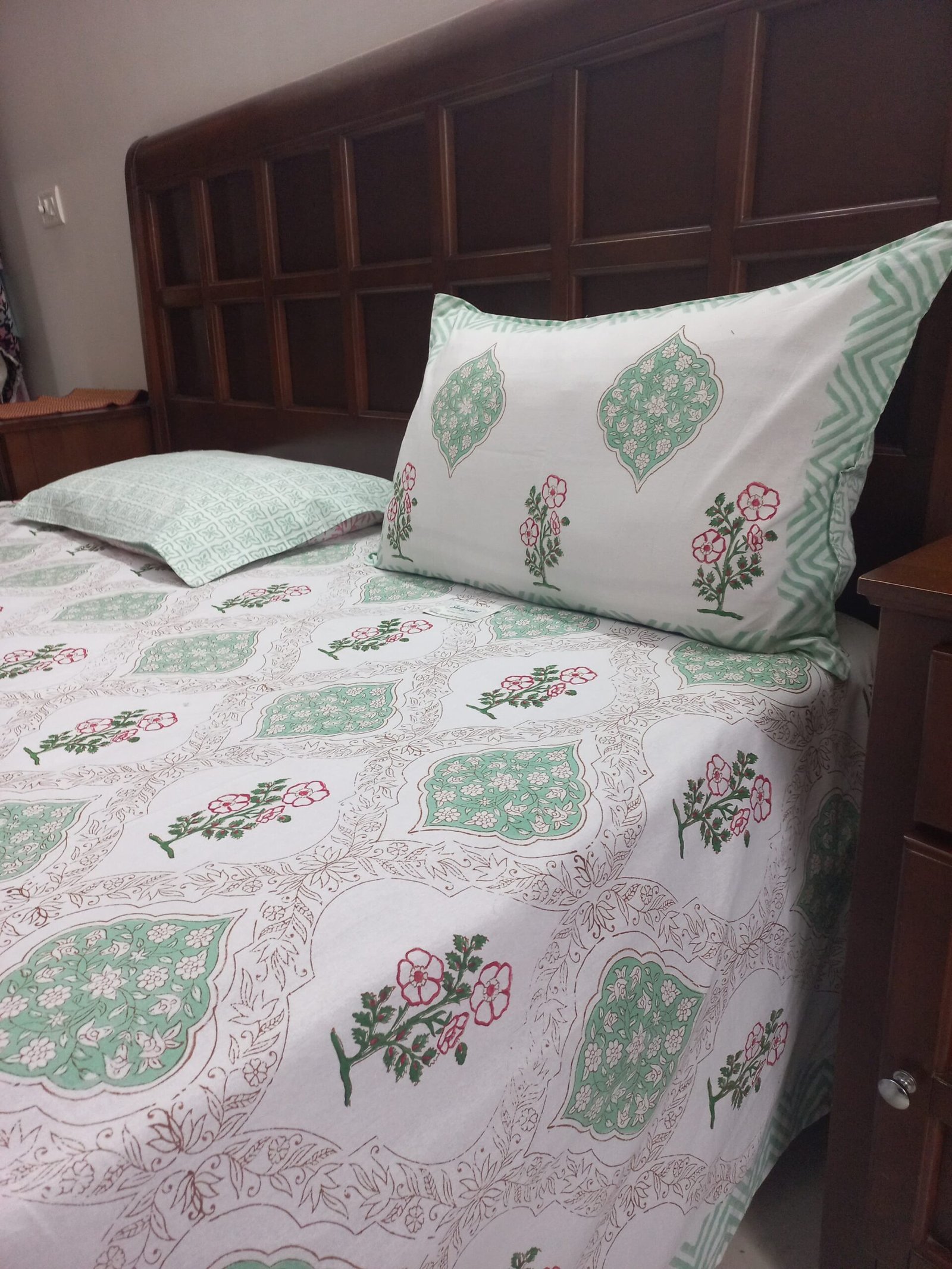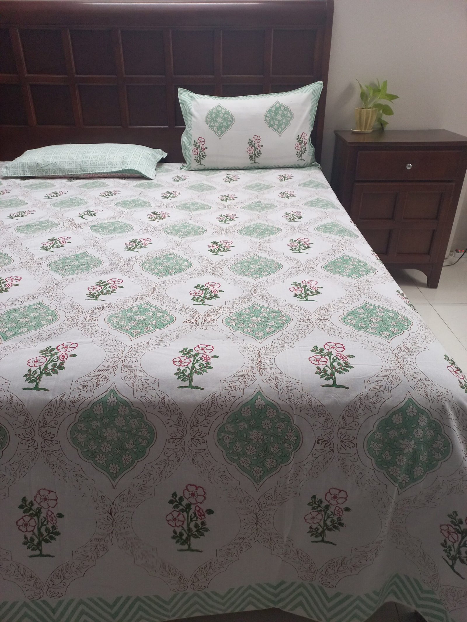 Each bedsheet showcases classic Jaipuri hand-block motifs—ranging from delicate florals and leafy bootahs to traditional jaals, borders, and playful ethnic elements—printed by skilled artisans using age-old techniques. The balanced layouts, soothing colour palettes, and coordinated borders add a refined yet lively touch to your bedroom décor.