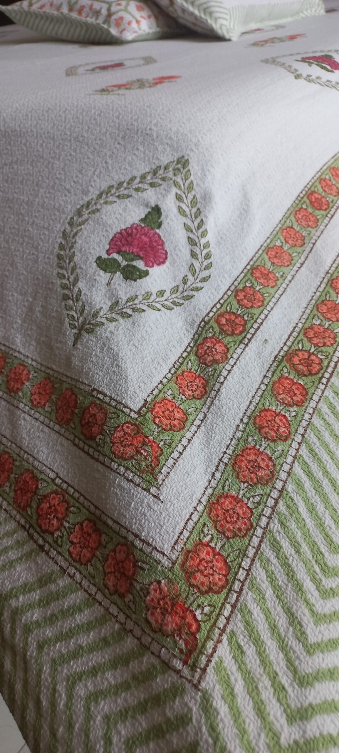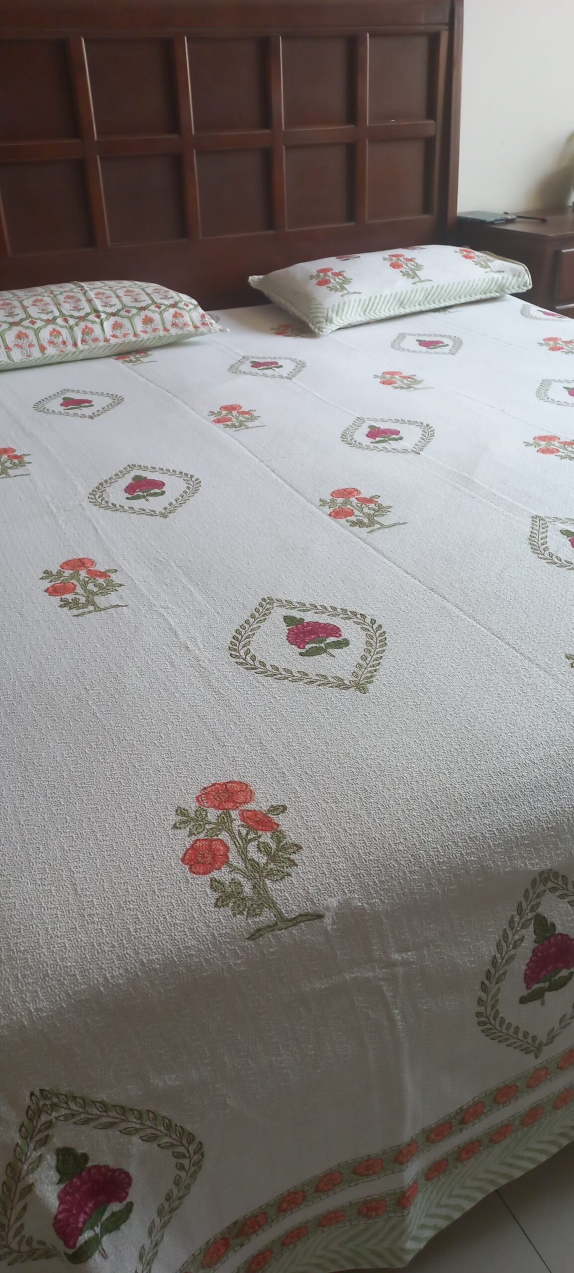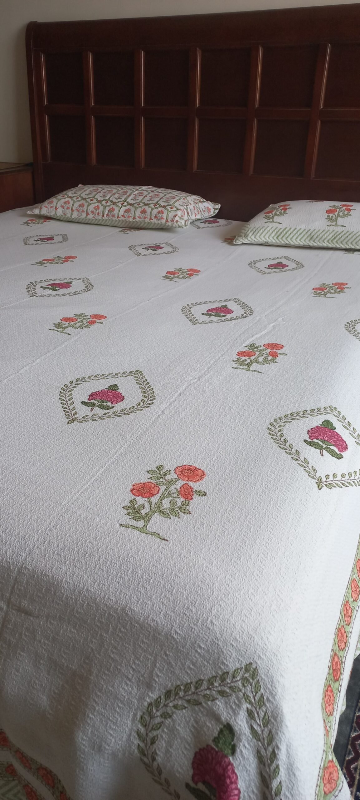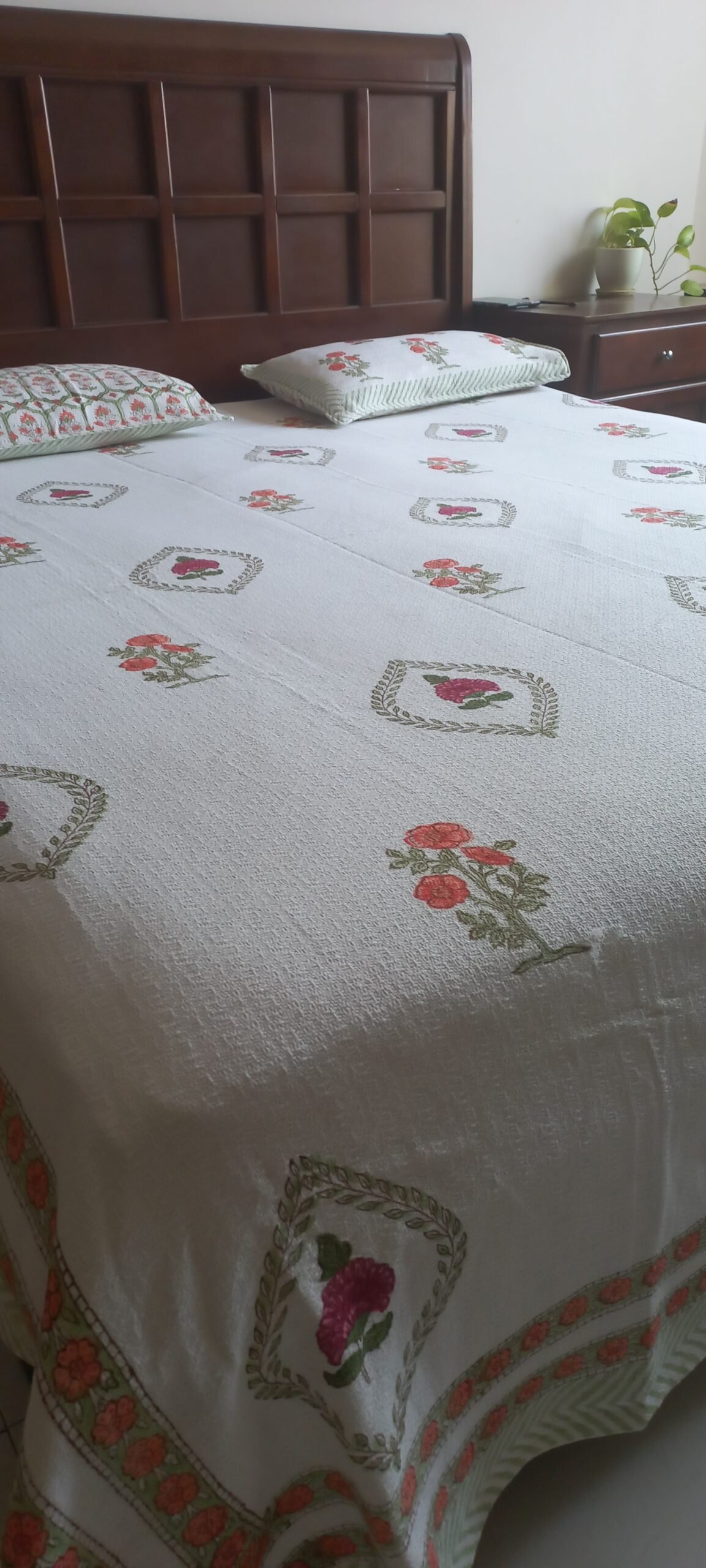 The bedcover showcases classic block-style printed floral and botanical motifs, inspired by traditional Jaipuri aesthetics and balanced with coordinated borders for a finished, elegant look. The dense weave gives the fabric a substantial feel, making it durable while remaining soft and smooth against the skin.