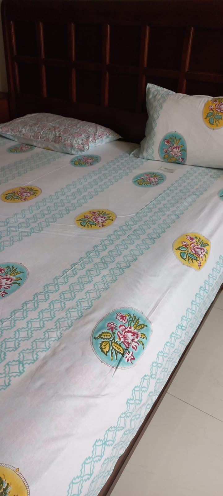 Transform your bedroom with the subtle charm of this Jaipuri hand-block printed cotton bedsheet. Measuring 95×108 inches, it is crafted from 240 TC pure cotton, offering breathability, softness, and durability for everyday comfort.