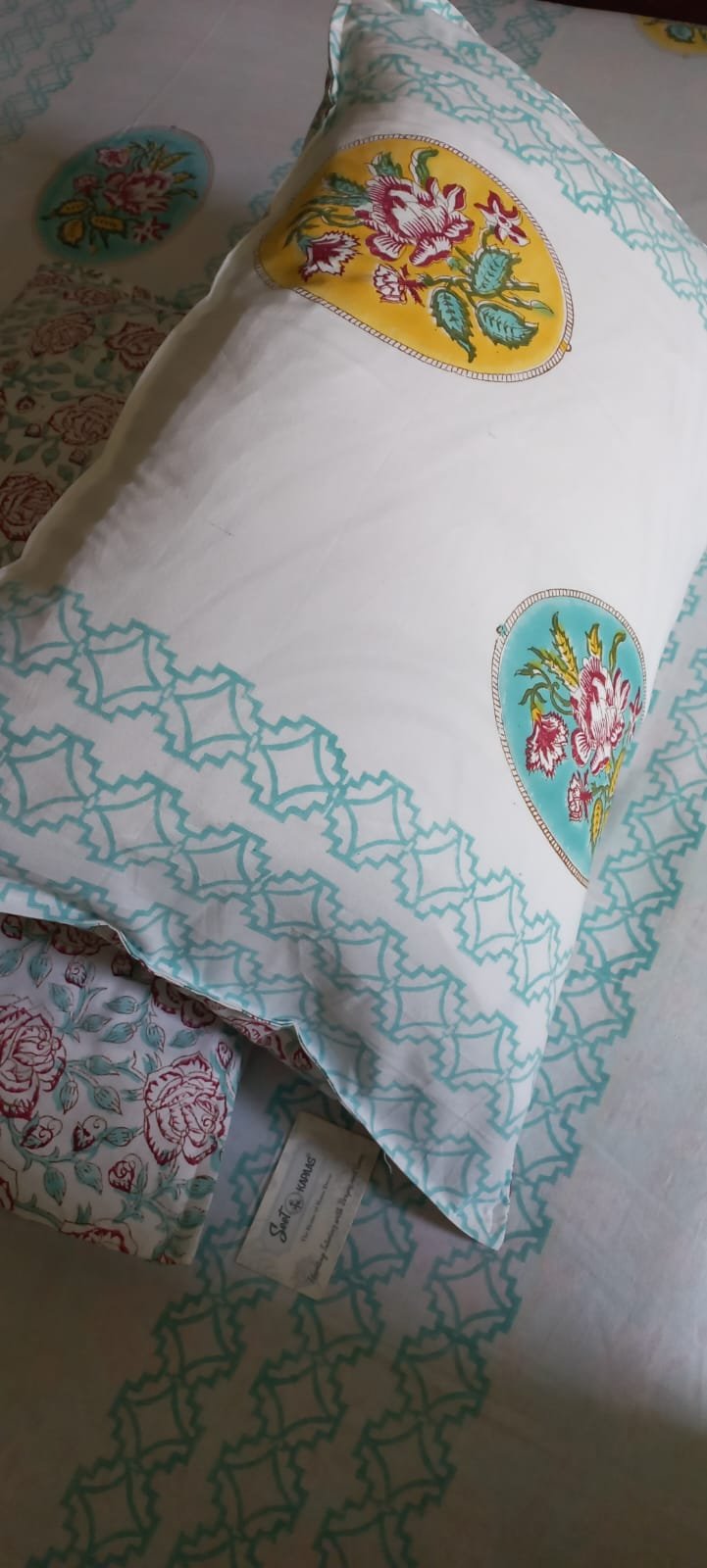 Paired with matching pillow covers featuring coordinated medallion motifs, this set is a perfect blend of heritage craft and contemporary elegance.