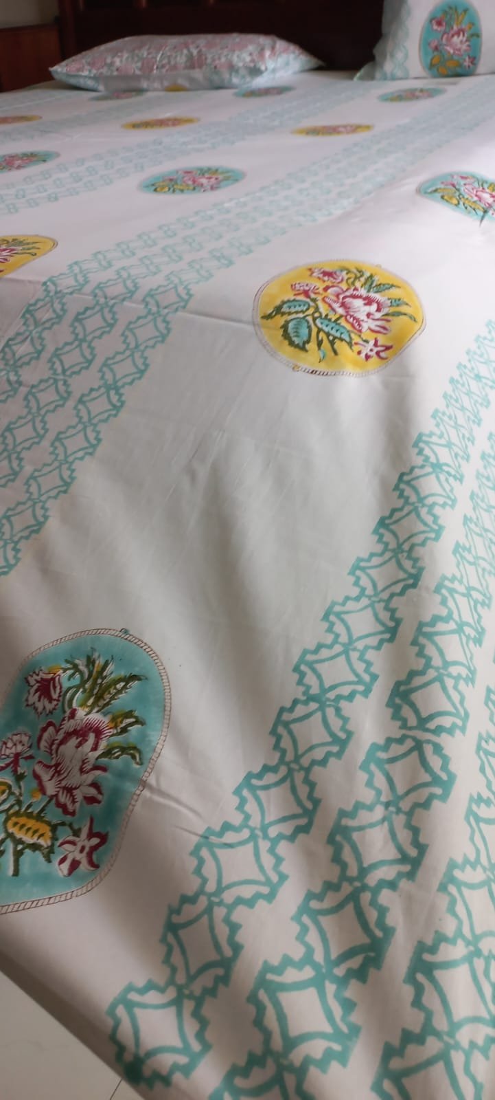 The design highlights alternating floral medallions in aqua blue and sunshine yellow, each intricately adorned with pink blossoms and leafy accents. These medallions are framed within turquoise lattice bands running parallel across the sheet, creating a structured yet airy rhythm. Set against a crisp white cotton backdrop, the pattern exudes freshness and balance — making it ideal for both modern and traditional interiors.