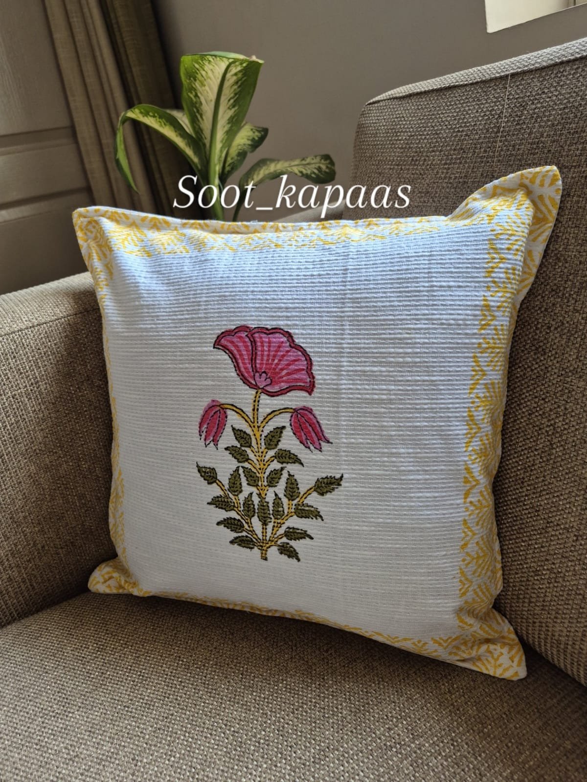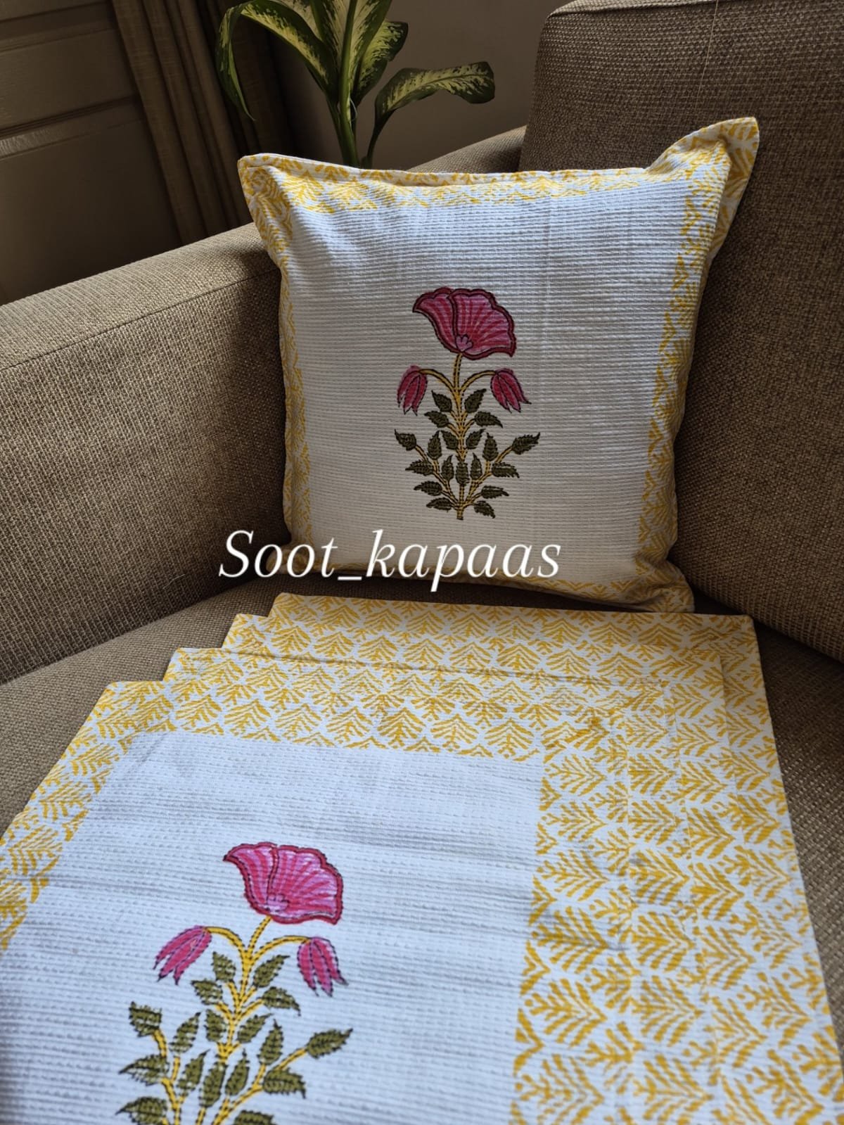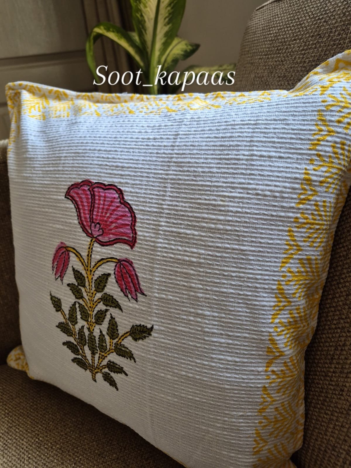 The design highlights a delicate Hand-Block printed floral motif placed gracefully at the centre, featuring soft pink blossoms with leafy stems that add freshness and charm. The serene off-white base is framed with a sunny yellow leaf-patterned border, creating a balanced composition that feels light, cheerful, and timeless.